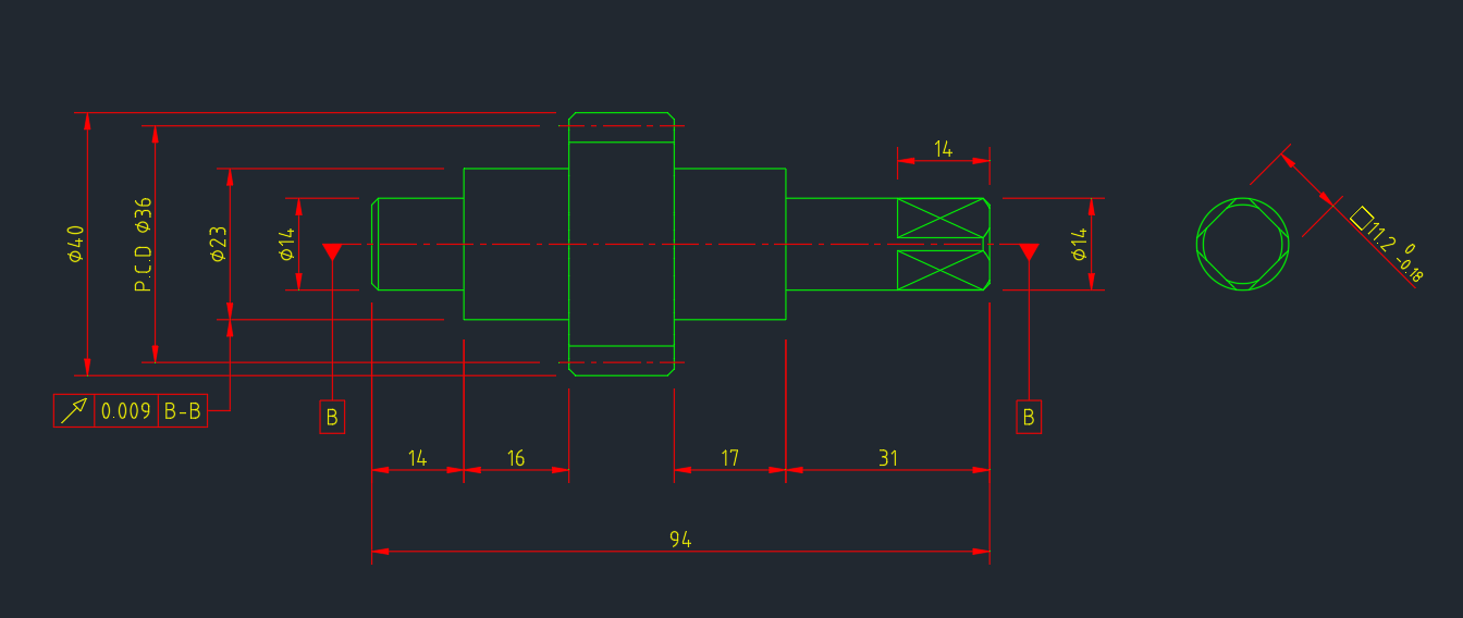 축 형상은 축을 데이텀 기준으로 잡고 원주 흔들림도나 원통도를 많이 사용하는 편이다. 여기서는 흔들림도로 작성했다.