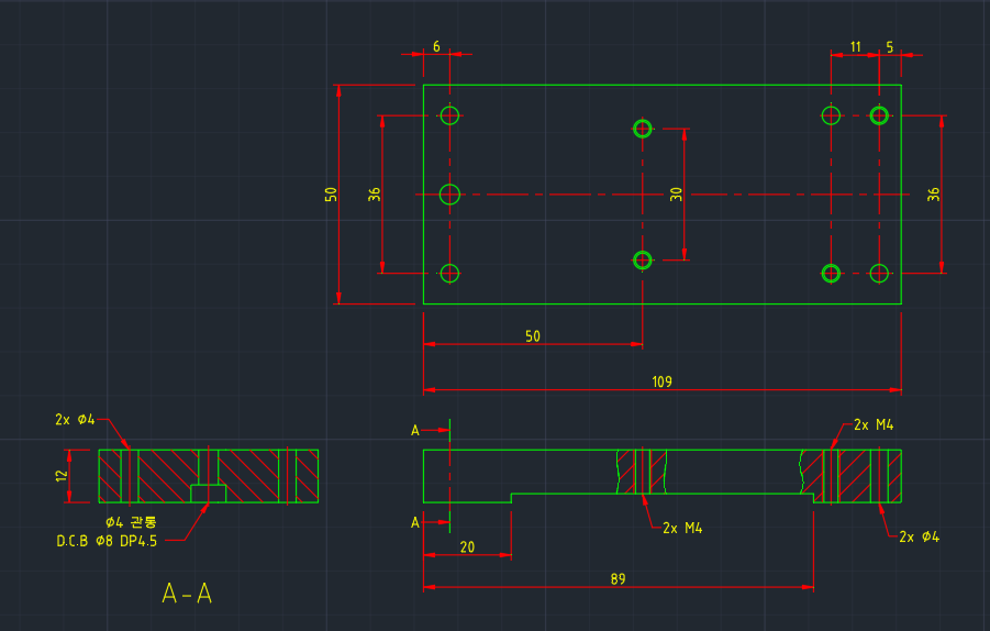 이후에 AutoCAD 도면에서 외형선이나 중심선, 해치, 치수까지 기입을 완료했다.